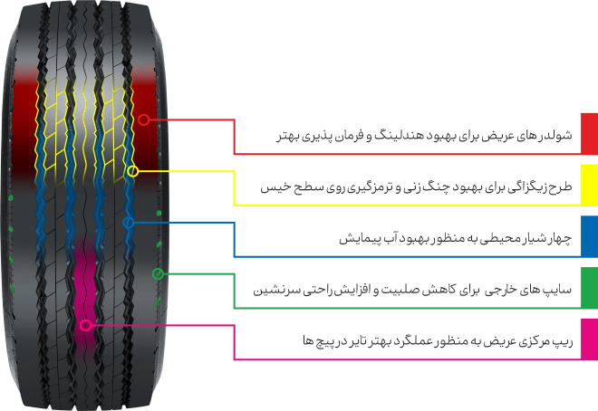 طرح گل زیگزاگ در تایرها یک نوآوری مهندسی است که با ترکیب شیارهای متقاطع و طراحی نامنظم، کارایی و دوام تایر را به‌طور چشمگیری افزایش می‌دهد. این طرح به شکلی طراحی شده که علاوه بر افزایش چسبندگی تایر به سطح جاده، باعث تسهیل در تخلیه آب، گل‌ولای، و اجرام جاده‌ای می‌شود. عملکرد خودتمیزشوندگی این شیارها از گیرکردن ذرات و کاهش کارایی تایر جلوگیری کرده و عمر مفید آن را بهبود می‌بخشد. همچنین، ساختار زیگزاگ فشار وارده بر سطح تایر را به‌طور متعادل توزیع می‌کند، که نتیجه آن کاهش سایش و بهبود ایمنی در شرایط مختلف جاده‌ای، از مسیرهای آسفالتی تا زمین‌های ناهموار است.